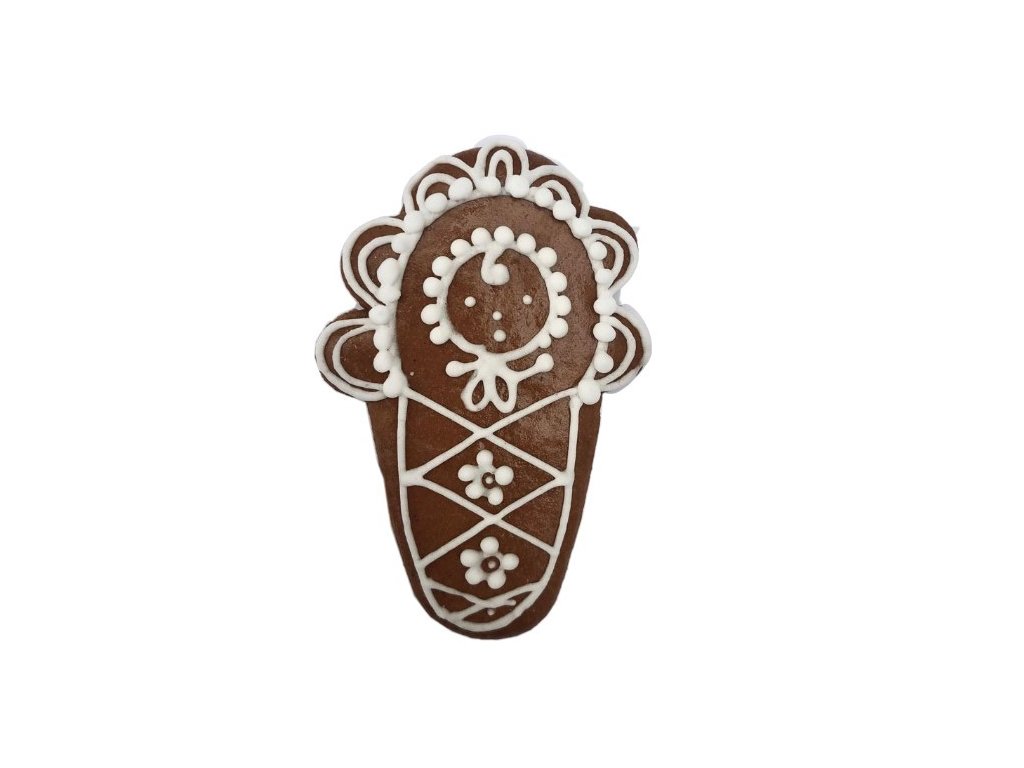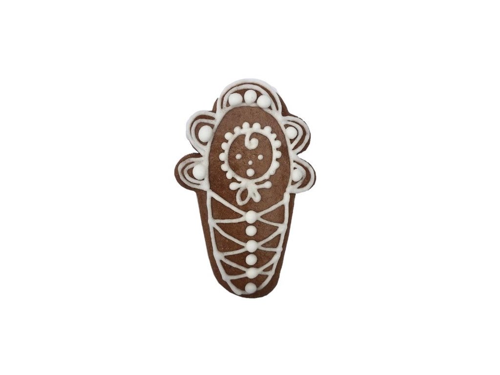 Složení: pšeničná mouka, cukr, med, máslo, vejce, jedlá soda, perníkové koření, kakao, poleva (cukr, bílek, citrónová šťáva, příp. potravinářské barvivo)